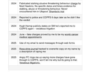 Someone is this group has some legal knowledge or is ex police and is able to write a document with enough fake “criminal points” to get through to COPFS and avoid police investigation. They don’t care about the law. It’s just done to get me sentenced for anything and if that doesn’t work they will try again with something else. This is a witch hunt. It is not stopping, it is vexatious litigation and I keep being charged and reported for things I just have not done. See here for years of policing, monitoring, abusive posts.