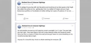 | 2019 | Shetland Police sent to tell me to stop sharing FB posts of whales. Arrested by Hugh Harrop Karen Hall for being a nuisance. Constantly being reported to police as intimidation tactic and process of punishment. See also NatureScot |