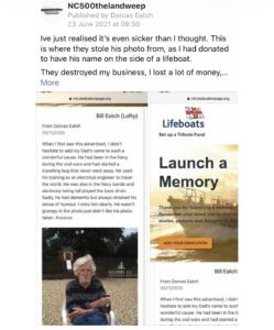 My Dads birthday is 31 December and of course celebratory days are a prime target for this Ullapool Shetland group. These were posted on Fathers Day deliberately. My Dad had dementia and died 2012 so they decided to impersonate him stealing his photo from the RNLI site, stealing Daisy’s photo as well (she had died a few years before though their version was I killed her). They even tried saying over SM I was lying about his birthday.