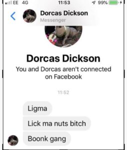 They found out where I went to school Chethams Hospital School of Music and just made fake profile after fake profile using my reg plate or bits of it or my Dads name or Daisy’s name tagging me as though I was part of the conversation. I wasn’t of course but they made it look as though I were.