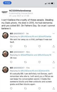 This is when this fake profile was trying to persuade people I didn’t know my Dads birthday. They say they actually researched Bill Eatch. I have lots of official documents marrying his name DOB and NHS number. Anyone remember the film Gaslighting?