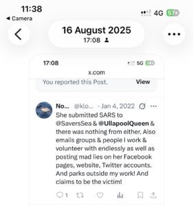 There is no evidence of targeting, threatening or harassing anyone. I have not encountered any of them. Libellous defamation. See shambolic trial where pushed to plead guilty for something I haven’t done. 25/09/24 registered at Ullapool medical centre for womb cancer treatment. *