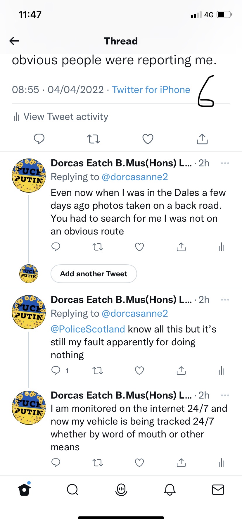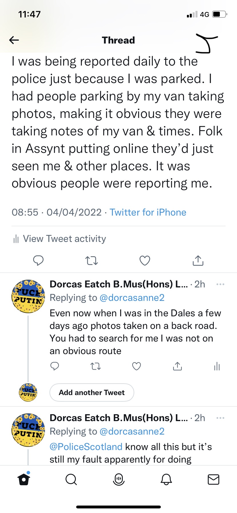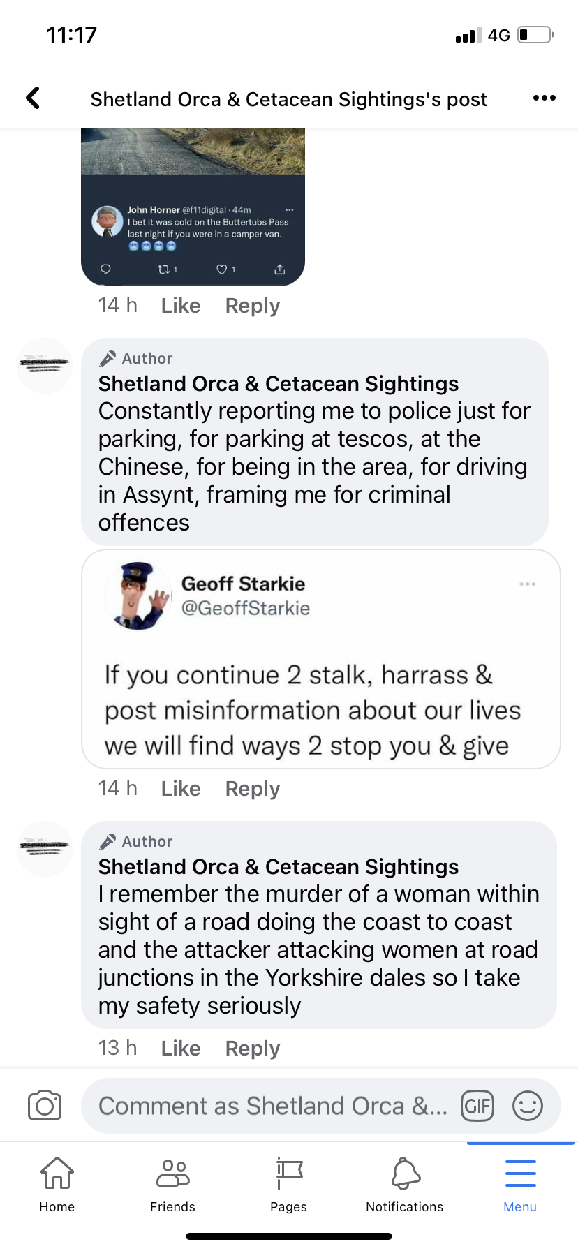 was publicly posting online on social media about my arrival in Ullapool within half and hour of me being there. (Policing and monitoring me).