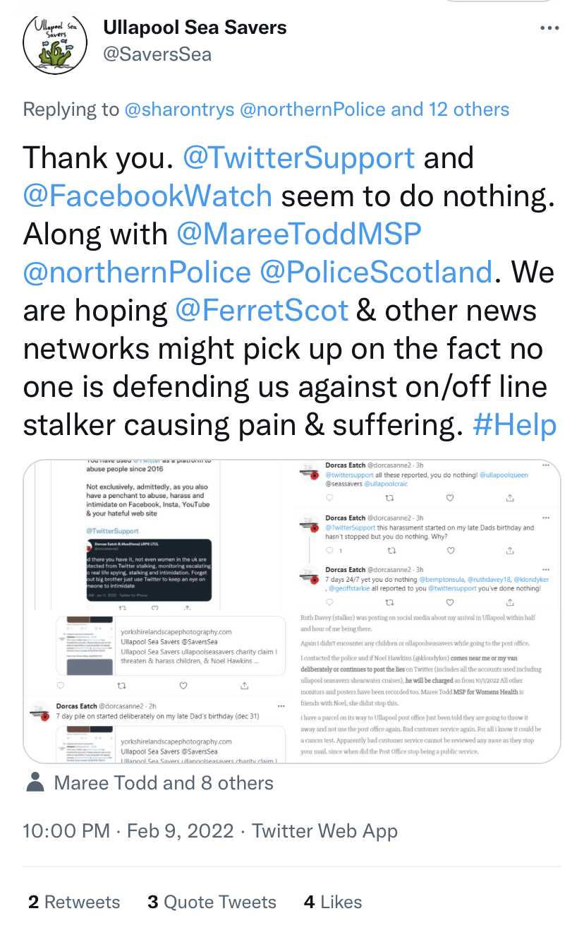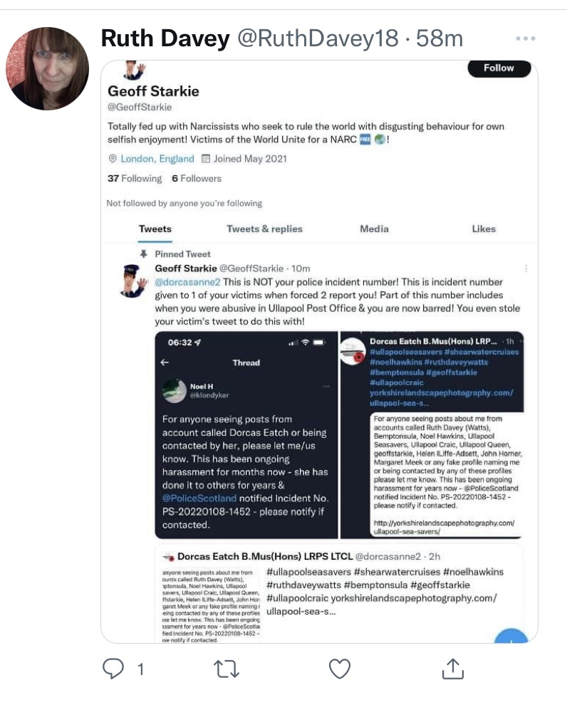 to stop yet here she is in public posts online talking of baiting to report me to the police (18/2/22), spying on me as I try to talk, sorry “bleat”, and interact with people going through similar experiences, how my business was destroyed, how they tried to take my LRPS off me at least x9 years daily, how they stole my Dads photo from the RNLI site and posted it publicly online with offensive messages etc ie ”bleating”. She has a cease & desist. It may have been a template but the wording was very clear to stop this and leave me alone, not to track me round Ullapool, not to keep lying to the police and MSPs for things I have not done, or meddling from afar during the parcel incident. Nothing to do with her. A stranger sticking her nose into other people’s business where it’s not wanted.
