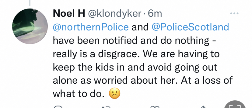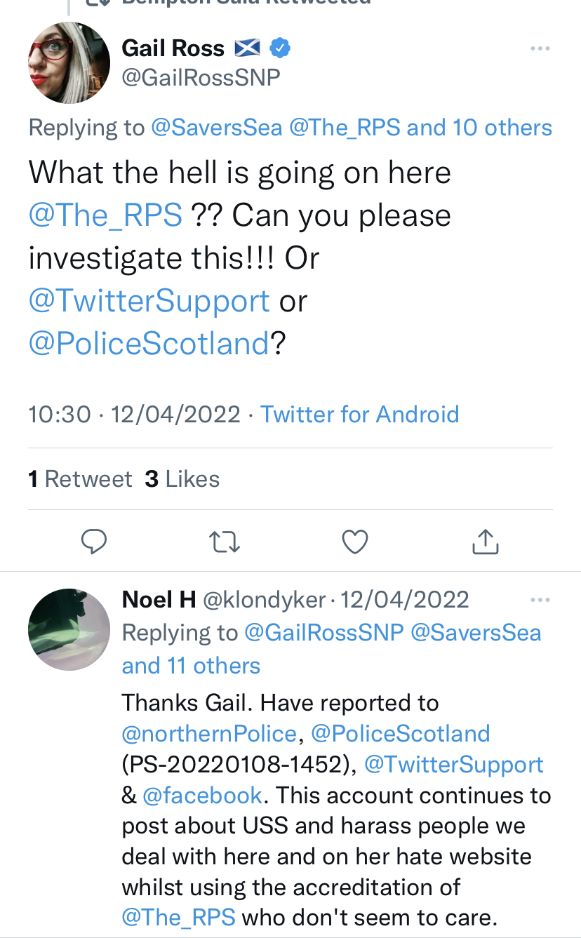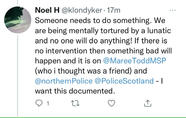 But they police me and Noel Hawkins klondyker still has public posts on google today wanting reports of where I am so he can report me to police and COPFS ( as far away as Inverness Tesco Extra at Inshes) even though