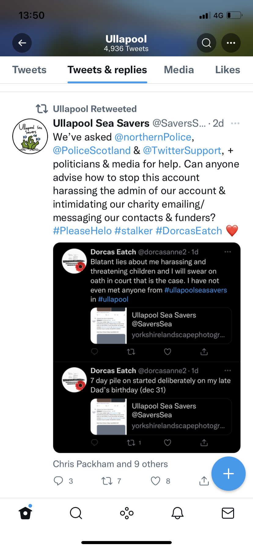 So over 100 anonymous profiles have been set up to report me to police, fabricate false allegations and fake charges all by same group of people above. And even while having treatment for cancer in Margaret Meek and Ullapool Sea Savers