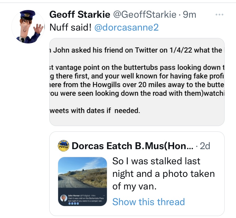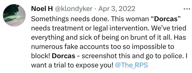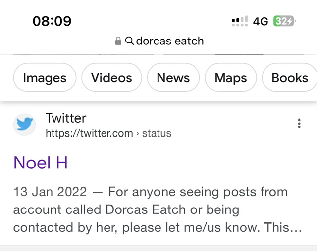 I lost the use of Twitter @dorcaseatch at 13:08 on 3/3/22. If it reappears again the abusers are using it to impersonate me. As they did during Margaret Meek trying to frame me for a criminal offence. They will steal my photos to make a credible fake profile but it won’t be mine. I will swear on oath in any court I had nothing to do with the Margaret Meek frame up.