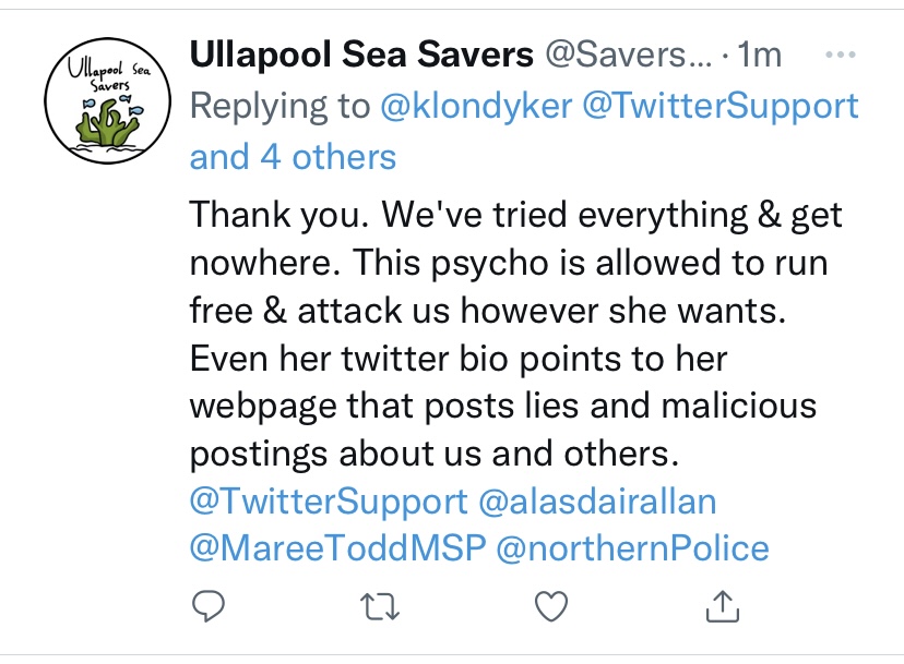 So Ullapool Sea Savers social media public posts say I threaten, harass and abuse them but I have never met them nor been near them.