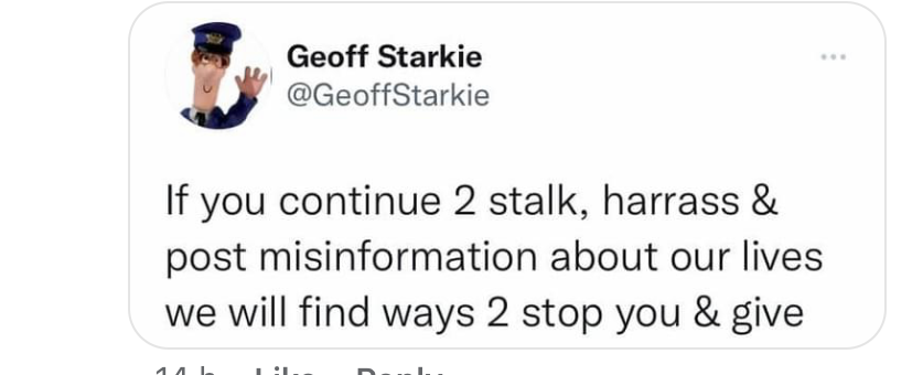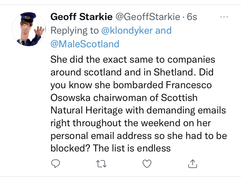 Geoffstarkie is a fake account from Ullapool. He is stalking me from the post office and posting confidential information he has no right to post.