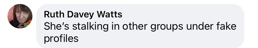 Ruth Davey Watts is now stalking my FB posts again causing me fear, alarm and distress. I’ve just had uterine cancer and a radical hysterectomy in May 2025. She is a complete stranger interfering in my life.