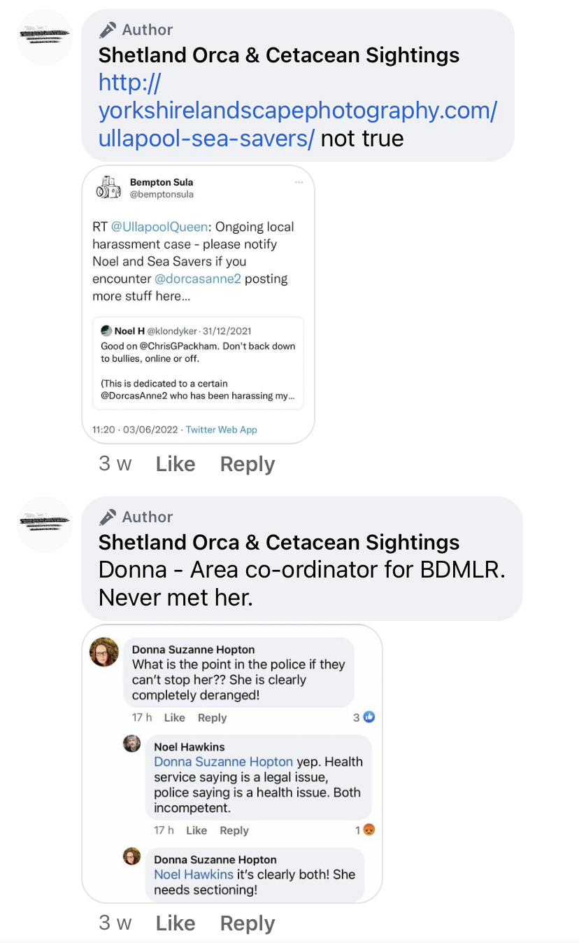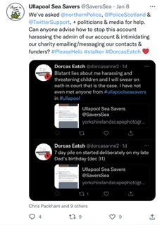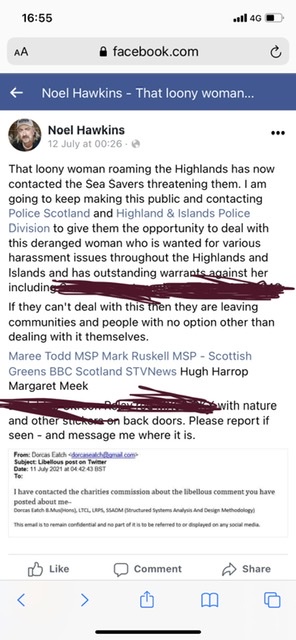 Noel Hawkins & Ullapool Sea Savers chose to post nasty comments publicly online. Encourage others to report me to the police. Choses social media to publicly post on.