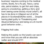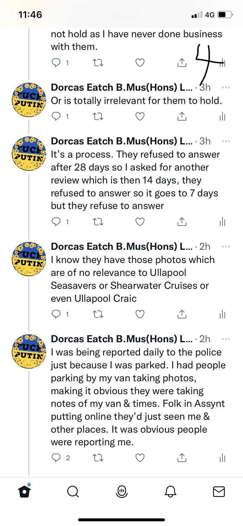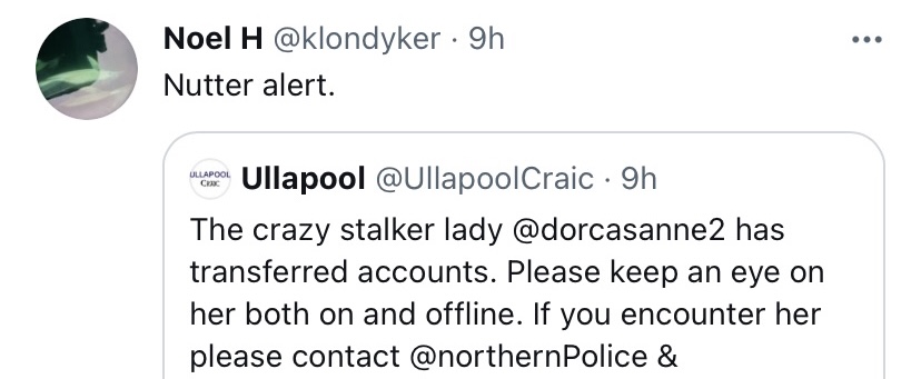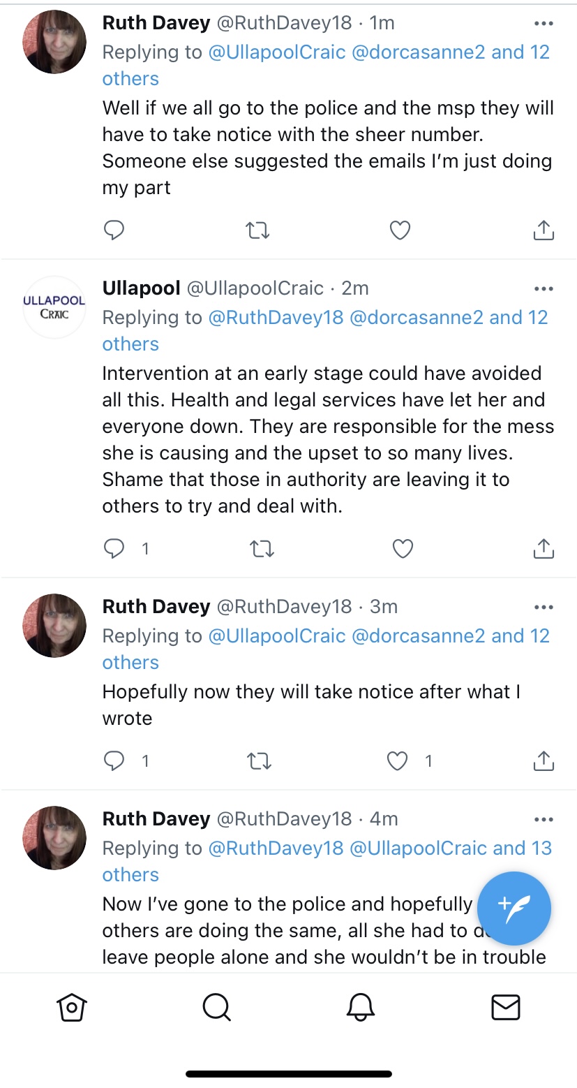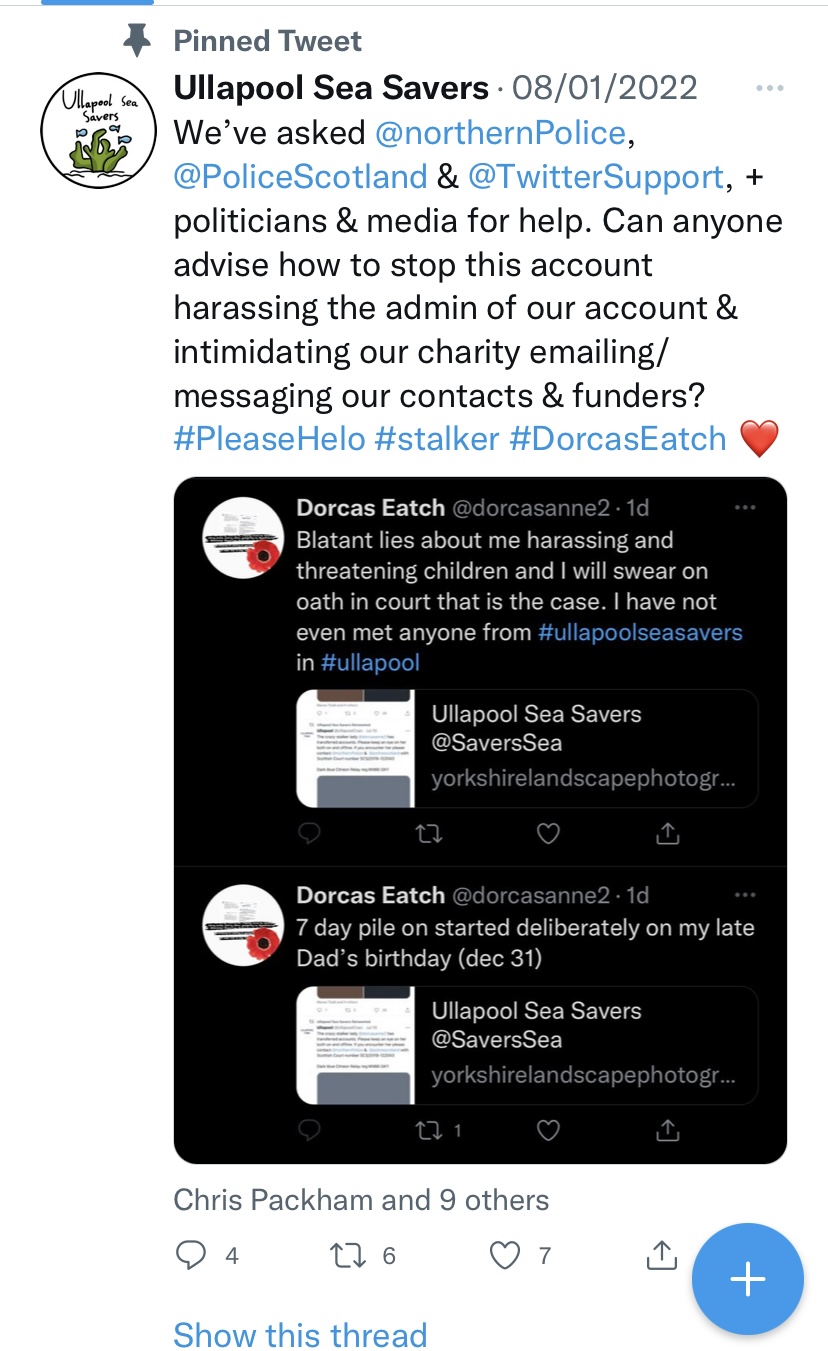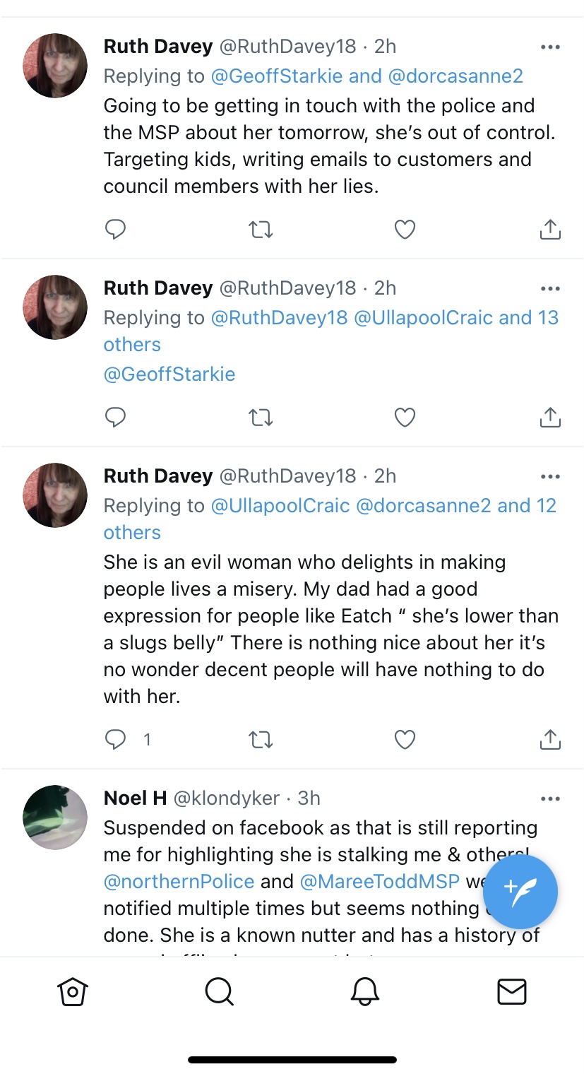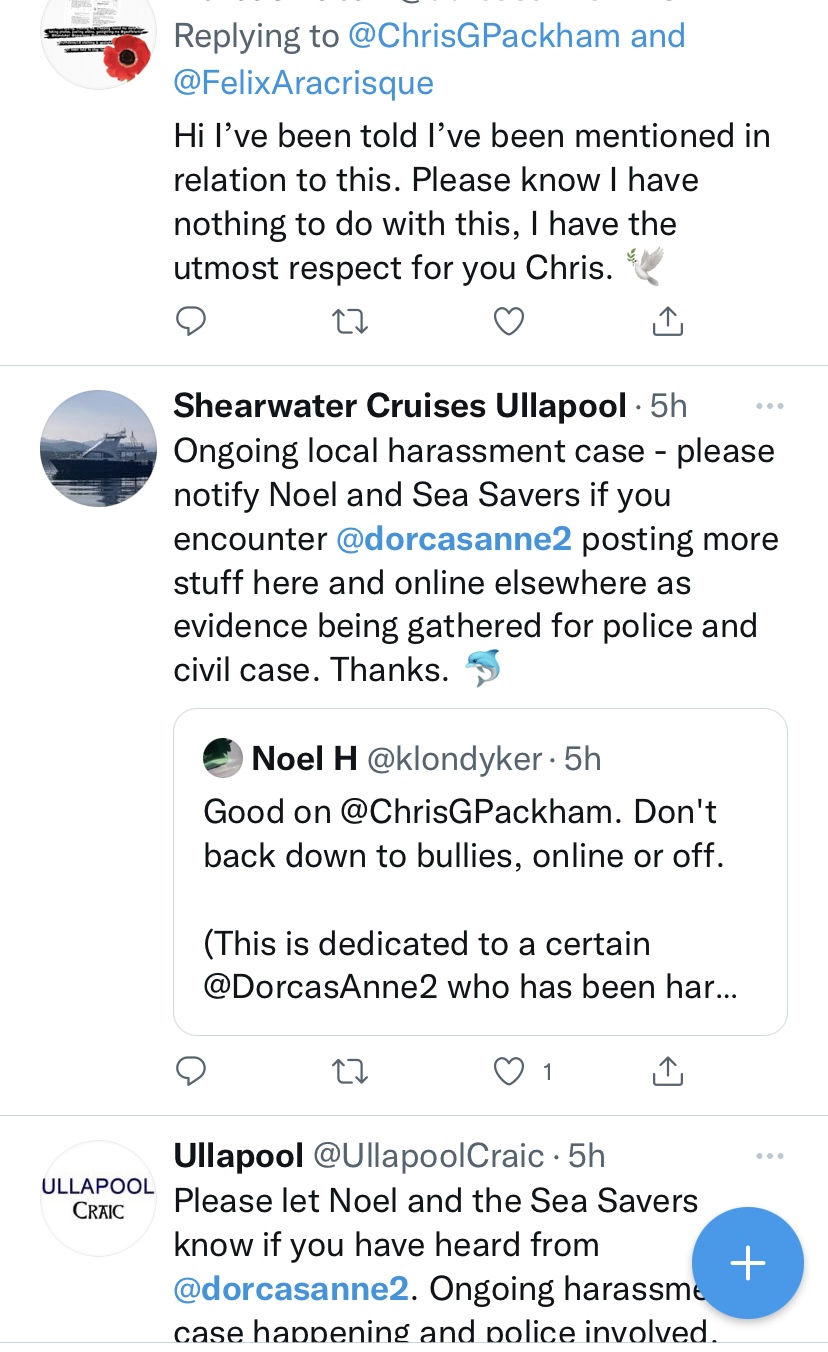 Then publicly posts online stating that “something bad will happen to me” or they will have to “deal with me” . All these accounts posting publicly online – Noel H, @klondyker, Ullapool Craic @ullapoolcraic, Ullapool Seasavers, ullapoolseasavers, Janis Piggott (Patterson) and Shearwater (Summer Queen) Cruises Ullapool. It is a witch hunt.