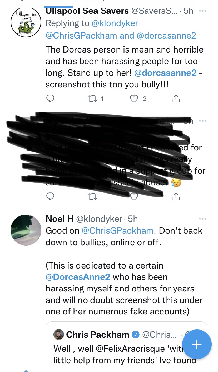 all these people have put in just to ban me from seeing any cetaceans in the UK including OrcaWatch and those organisations supporting this bullying and threats to ‘deal’ with me is incredible – Cath Bain BDMLR WDC HWDT, Steve Truluck, Steve Truluck WhatsApp, Seawatch Foundation, FB Caithness & Moray sightings page, FB Aberdeenshire sightings page, FB Hebrides and NW sightings page and many more. All listed on the gangstalking timeline.