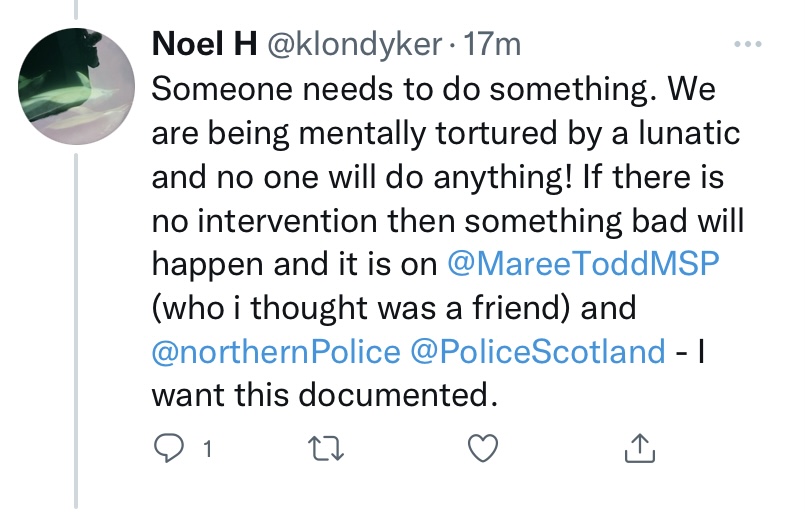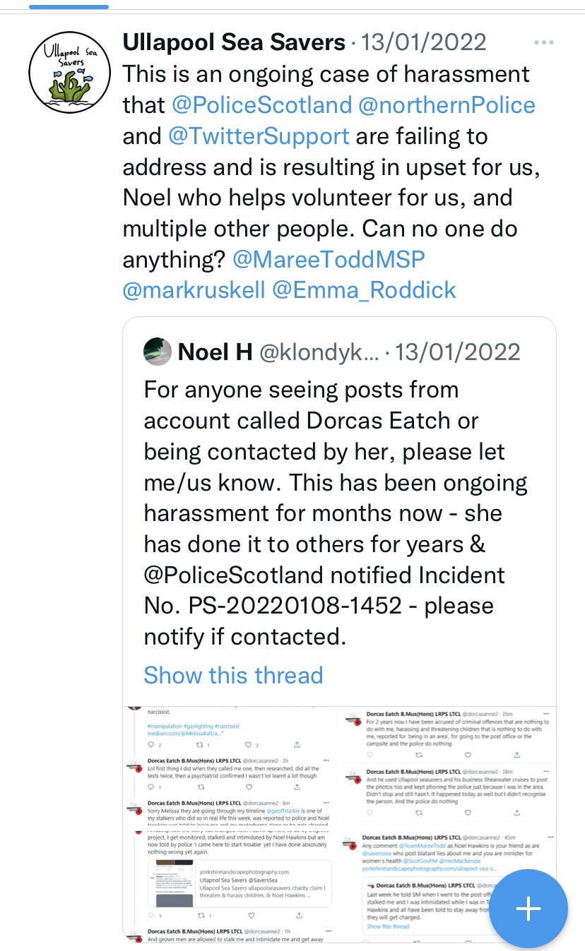 So Contacted the police and Noel Hawkins (@klondyker) has been warned not to come near me or my van deliberately or continue to publicly post the lies on Twitter (includes all the accounts used including ullapoolseasavers, ullapool sea savers shearwater cruises), as of 10/1/2022 All other monitors and posters have been recorded too. Maree Todd MSP is friends with Noel, she didnt stop this. Did he stop? No.