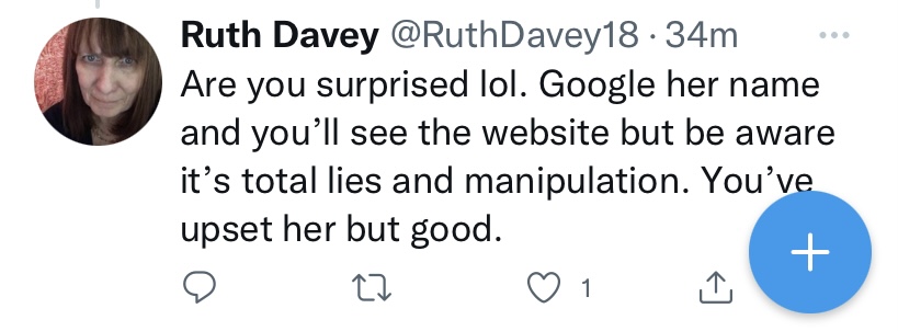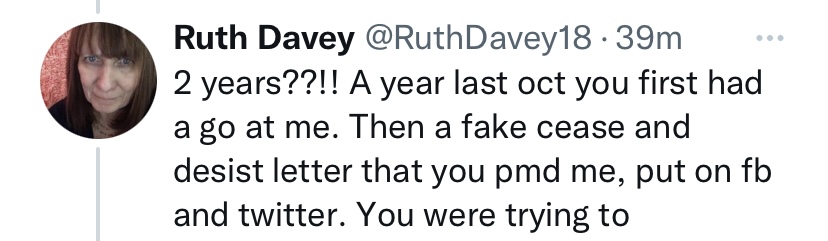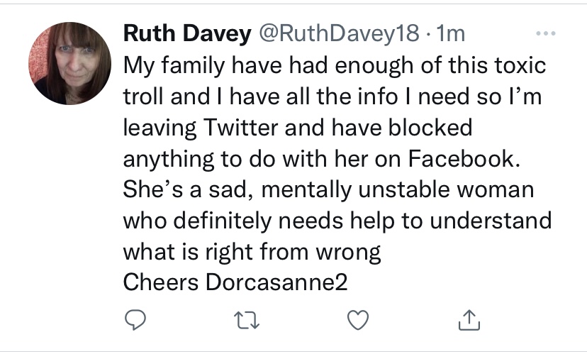 For many years she has been told to stop. She’s had a cease and desist letter yet she keeps spreading lies and trying to incite more hate against me. Ruth Davey has reported me to the police. Sometimes she insists she hasn’t or says she calls the police to shut me up.