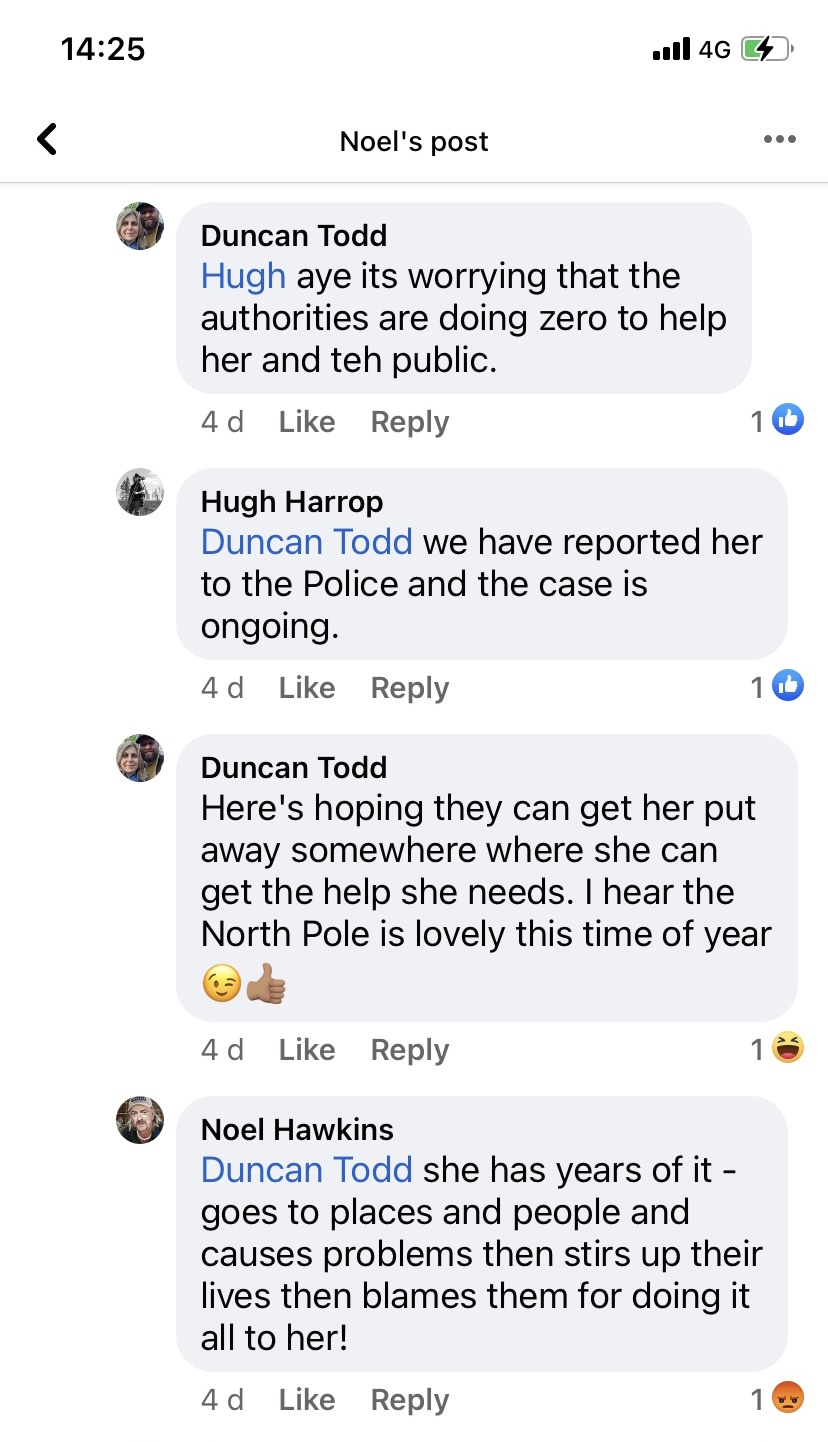 Then since July 2021, Noel Hawkins klondyker public social media posts ask people to report me to the police for being “in the area”, ie Tescos, car parks and report TO Noel so he can “deal” with me, ”sort me out” – a 66 yr old woman with long covid. So their public posts are still online today and searchable by anyone.