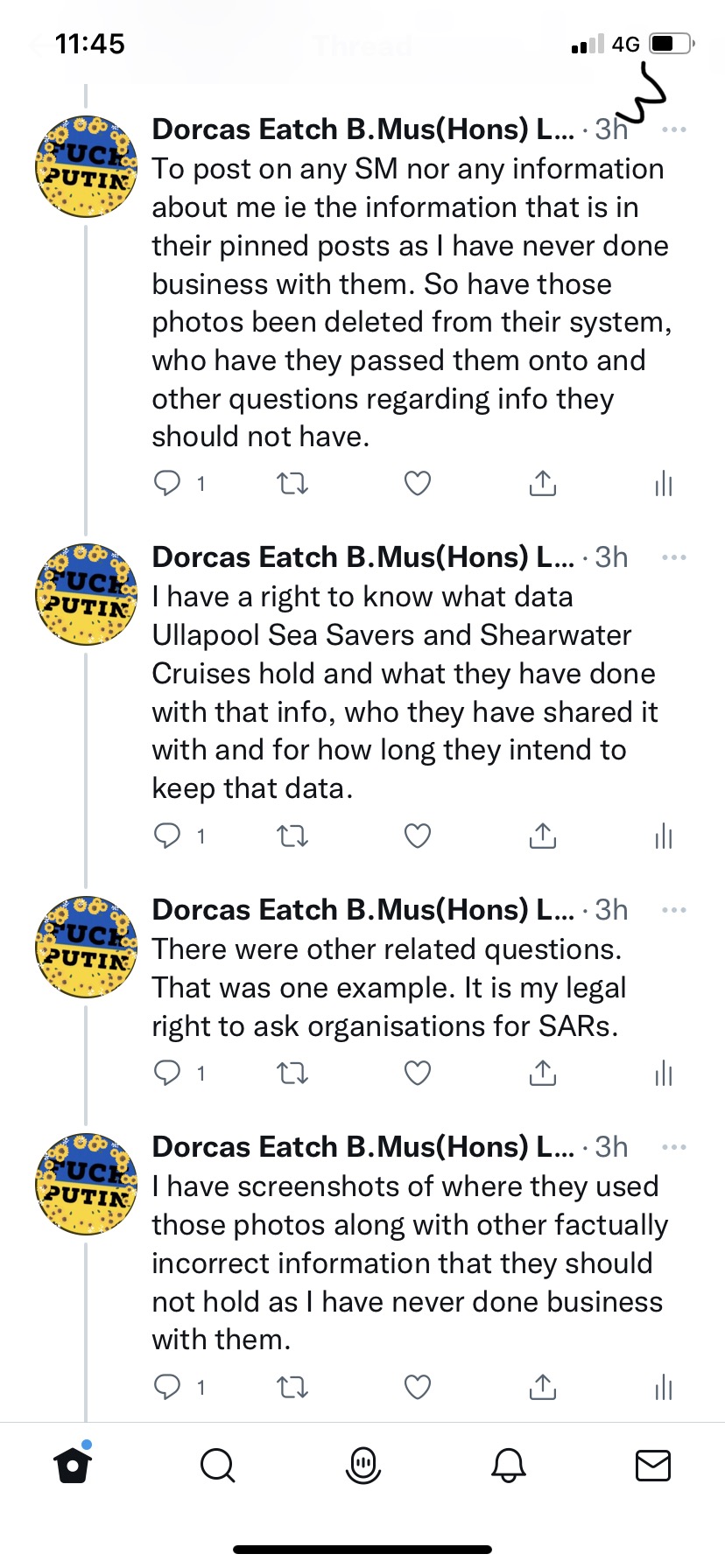 As a charity (UllapoolSeaSavers) and also the business Shearwater Cruises, with whom i have not had any contact, they should not have any data about me. Nor should they be publicly posting online any information in any form about me on a social media platform. And yes did report them to OSCR who also thinks this bullying is acceptable. Not should they be sharing any information about me.