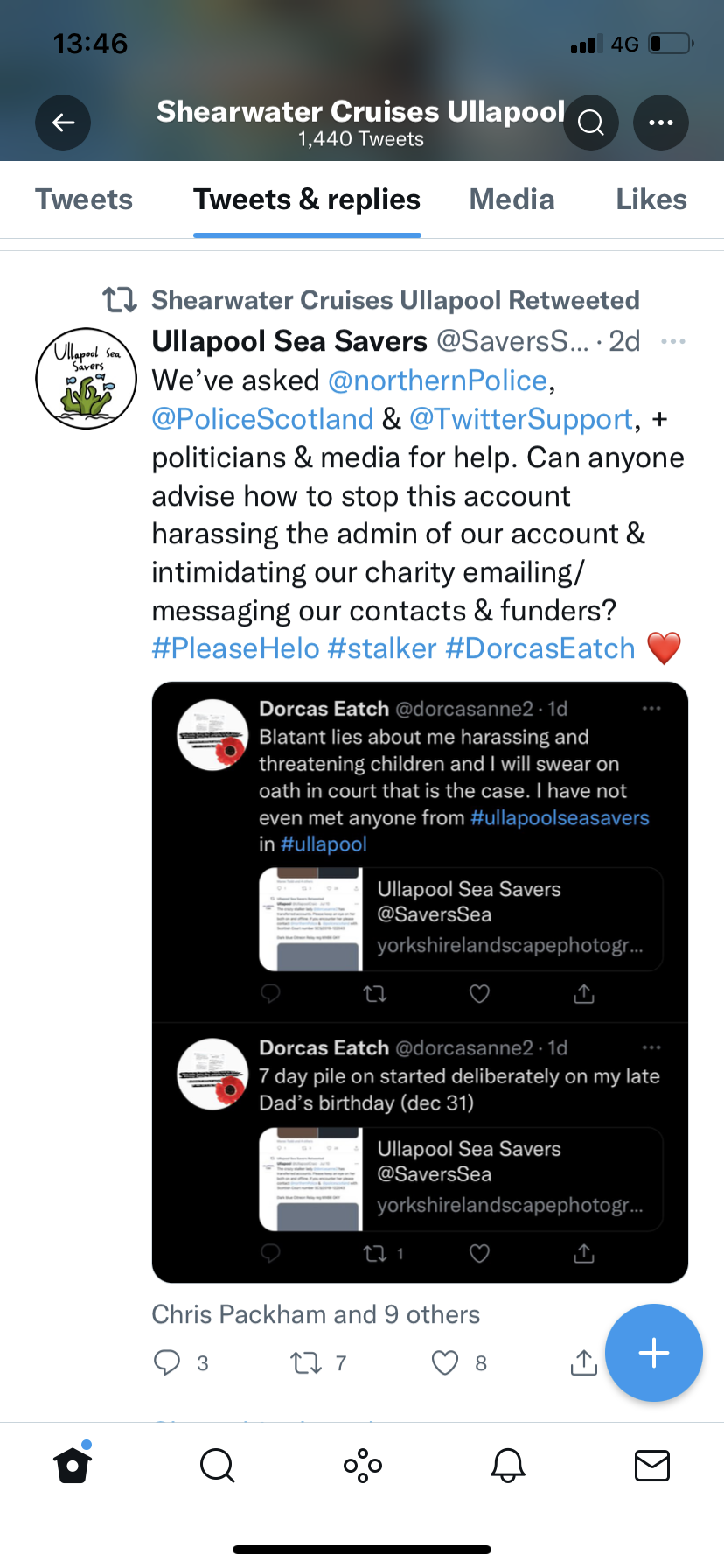 This is incomprehensible nonsense. They are lying, making things up that are just not there and then they report me to the police. Again I have not had any contact with anyone in Ullapool or ullapoolseasavers or Shearwater Cruises. there are no victims here.