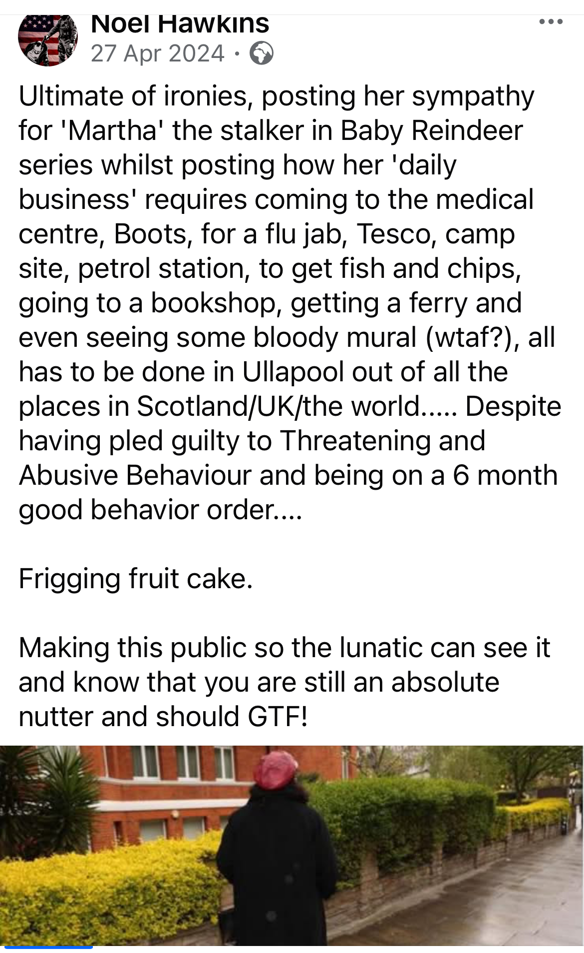 i found this the other day that I posted on the day they posted online I was supposed to be stalking Ullapool man. As the police never contacted me about any of this they couldn’t have told me to stay away – misinformation and lies And we now know that fake account was Hawkins.