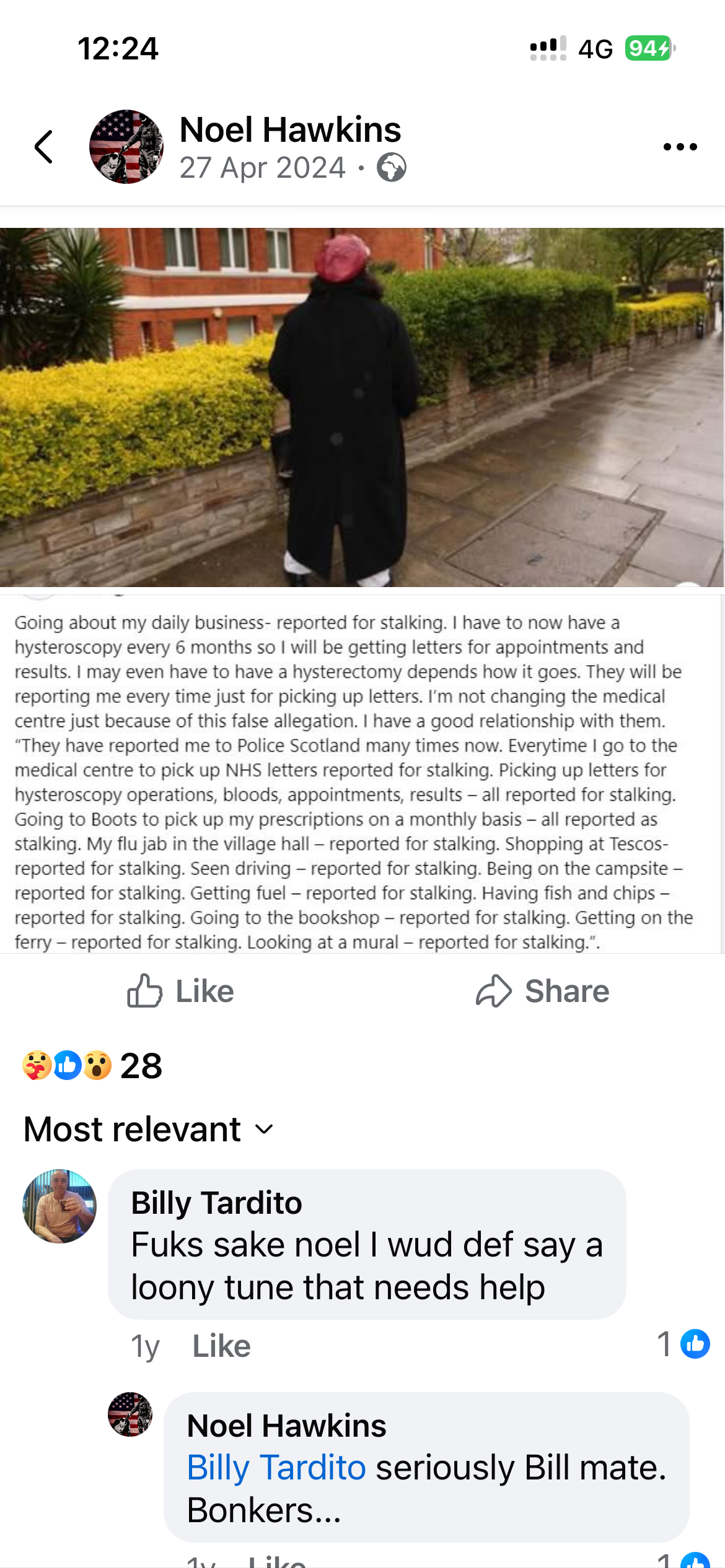14/2/25 So I’ve just heard from my consultant from Raigmore and my endometrial hyperplasia has worsened so we are talking cancer here caught early hopefully – not helped by the chronic stress of the false allegations and fake charges of Noel Hawkins klondyker reporting all my visits to the medical centre as stalking and abusive and threatening behaviour.