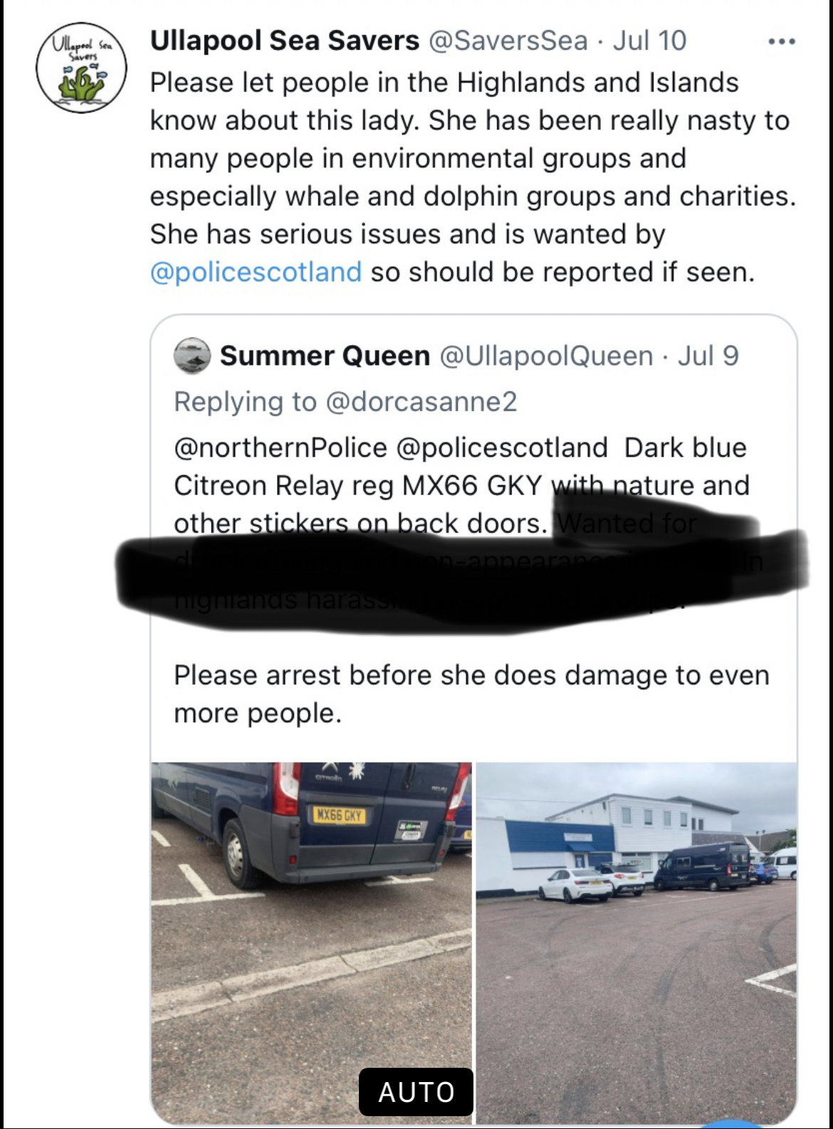Ullapool Sea Savers, ullapoolseasavers, shearwater cruises, ullapoolcraic, Noel Hawkins klondyker are conducting a witch hunt against me, stalking me, policing me, monitoring me and encouraging everyone in Ullapool and the Highlands to report me through public online posts and via open crime reference numbers publicly posted online, to publicly report my van online and to Hawkins and Police Scotland because they want to get me arrested/sectioned since July 2021.